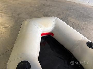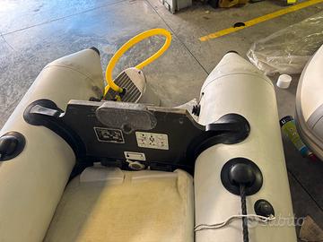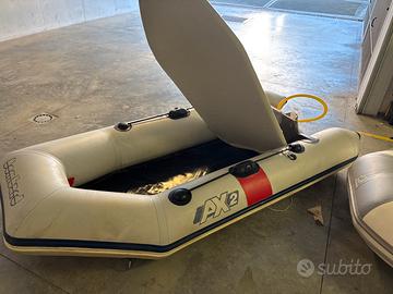Tender Bombard modello AX 2 Aero colore grigio con fondo gonfiabile. Questo tender della serie AX Aero si distingue per il fondo gonfiabile ad alta pressione (800 mb) e quindi rappresenta un'ottima scelta per chi desidera averlo pronto all'uso in tempi rapidissimi. La composizione del suo tessuto denominato "Strongan" è pari a 1100 decitex, quindi lo rende altamente resistente anche per impieghi gravosi, è omologato per 2 passeggeri + 1 e la motorizzazione consigliata è da 2,5 a 4 cavalli. La dotazione prevede: remi in alluminio, gonfiatore a pedale, sacca trasporto, kit riparazione e manuali.