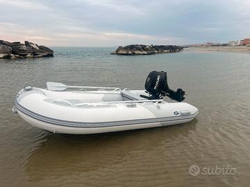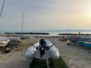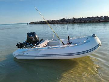 Vendo fantastico tender 320 cm ultraleggero con chiglia in alluminio e gavone. Tubolari (42cm) a 3 camere in pvc. Completo di motore Suzuki 15 cv anno 2025 con circa 60 ore di moto. Gommone più motore completo di tutti gli accessori come: - Carrello da spiaggia - Telo invernale e telo copri motore, remi, gonfiatore, ancora e cima, serbatoio 12l; - n°2 maniglie inox come da foto(porta canne a parte se interessati); - Panchetta in alluminio con cuscino e borsa Completo di tutta la documentazione necessaria. Tutto anno 2025 in garanzia tenuto maniacalmente come si può evincere dalle foto, nessun difetto. Vendo per passaggio a categoria superiore. Omologato per 4 persone, lunghezza 320 cm x 156 cm di larghezza categoria C, peso tender 64 kg. Si valuta la vendita anche per solo gommone Prezzo trattabile dopo visione.