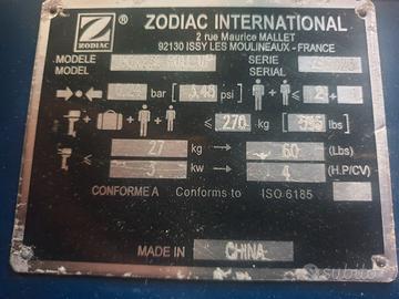 Tender Zodiac Metri 2.30, portata 270 Kg motore fino a 4 cv, completo di panca, pompa, remi, modello che si sgonfia si piega e si ritira in un borsone