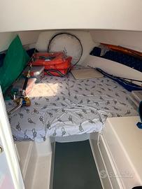 per due persone completo di cuscineria in ottimo stato , luci di servizio nella cabina nel pozzetto e sul tettino , verricello salpancora elettrico , due batterie , pompa di sentina automatica ,serbatoio acciaio inox 90lt, serbatoio per ausiliario 25 lt separato .