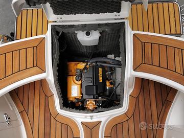 Nel gavone di poppa può essere installato un motore entrobordo Yanmar, un entrofuoribordo a benzina o elettrico, oppure, nella soluzione più economica, un fuoribordo su pantografo ad alta portata, di nostro brevetto.