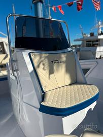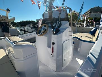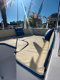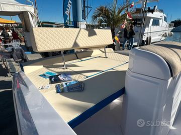 Due grandi prendisole, prua e poppa, arricchiti da cuscineria completa, per il massimo comfort in navigazione, struttura planante che garantisce ottime prestazioni anche con motorizzazione leggera, seduta posteriore abbattibile per trasformare la zona poppa in un prendisole esteso, aumentando la vivibilità con uno spazio relax doppio.