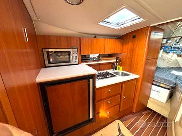 Imbarcazione in perfette condizioni. Molto ben accessoriata. NATANTE ANNO 2003 2 X 330 HP CUMMINS Lunghezza 10,31 m Larghezza 3,66 m Dinette trasformabile, divano con tavolo pranzo, letto matrimoniale, cucina attrezzata con lavello, 2 fuochi, forno microonde e frigorifero. Bagno. Spazioso pozzetto. Pavimento dinette in legno. A prua MINN Kote quest 115/110 ( motore elettrico fuoribordo da prua progettato per mantenere una barca in una posizione fissa o per navigare seguendo una rotta specifica) con batteria. Allarme motore, Allarme sentina, Ancora, Autoclave, Batterie, Bussola, Caricabatterie, Contamiglia, Doccia esterna, Ecoscandaglio, Faro orientabile, GPS (Lowrance HDS 16" con sonda NUOVO), Hard top, Impianto antincendio, Lavandino nel Pozzetto, Log, Luci di navigazione, Piattaforma (di poppa), Pompa di sentina automatica, Pompa di sentina elettrica, Radio VHF (Garmin), Salpa Ancore Elettrico, Scaletta da bagno.