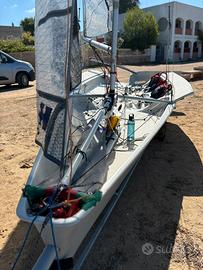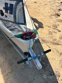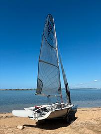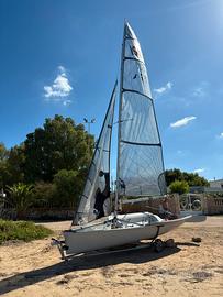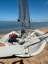 Deriva a vela planante con trapezio singolo veloce e divertente. Carrellino per varo/alaggio, randa, fiocco e gennaker con bompresso estraibile. Lunghezza 4,70m, larghezza con terrazze 2,2m senza 1,70m, albero 7,10m. Non scambio