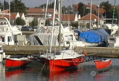 Trimarano pieghevole da crociera MATTIA T11 del 1982 Spettacolare ,scafi rosso ferrari coperta grigio perla, inaffondabile, riverniciato 2021 buona abitabilità e alt. interna, mt.11,25X8 aperto/4 chiuso, pescaggio 0,65/1,80 con deriva mobile VTR pivottante, apertura elettroidraulica telecomandata 30 sec. rifatto interni meglio del nuovo 2018, riverniciato 2021 entrobordo saildrive300 4tempi benzina 15hp 2017, basso consumo poche ore moto,2 serbatoi carburante 1 fisso inox 50lt 1 mobile portatile plastica 30lt, molti ricambi, randa steccata FULLBATTEN avvolgifiocco genoa +genoa pesante avvolgibili tormentina, spi con calza , code0+frullone+bompresso inox 2022, strum.vento/log/eco TACKTICK fotovoltaici Wifi, Gps ,2bussole, 2 ancore salpancore elettrico ,frigo ,4gas+grill, autoclave+2serbatoi acqua lt.100cad.tot.lt200 2batterie nuove 2025 +both +caricabatt.swiching, 3prese12V+3prese220V+salvavita ,lazybag+lazyjack ,bimini ,2tendalini ,passerella pieghevole alu, . Cert. sicur.13/04/2022 valido 5 anni, navigazione senza limiti. Visibile Monfalcone Ocean marine. possibilità subentro posto barca .Location strategica per escursioni/viaggi nel territorio e per crociere lungo costa e tra le 1000 isole della Croazia . Visite su appuntamento solo con dimostrato interesse preliminare di acquisto.PREZZO TRATTABILE. Vendo per motivi di salute e di età (81)contatti: Antonio 3358125170