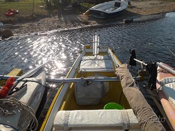 vendesi trimarano a vela Virus Plus 16 del cantiere francese VIRUS BOATS, armato con randa alla portoghese più fiocco, un piccolo motore fuoribordoelettrico, cuscineria, remi,