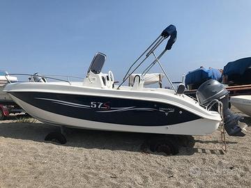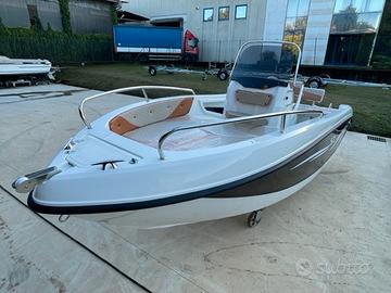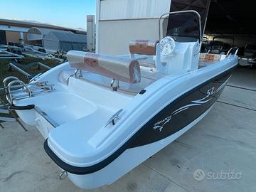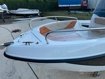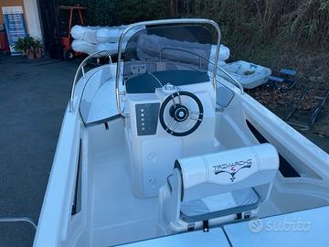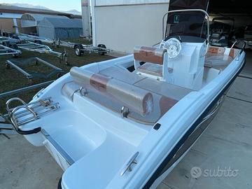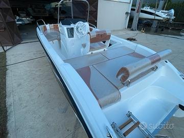 Barca già completa di fascia colorata nera, schienale alto a poppa, prolunghe prendisole, tasche laterali, sedile monoposto fronte consolle, scaletta bagno, luci, sentina, pannello elettrico moderno, serbatoio carburante fisso da 70 litri con carico esterno.