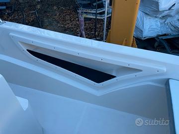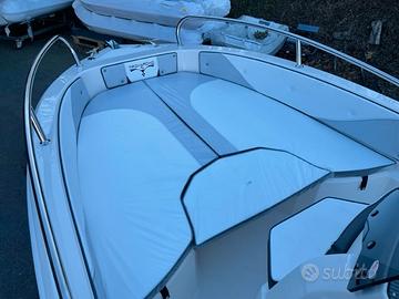 Barca già completa di fascia colorata nera, schienale alto a poppa, prolunghe prendisole, tasche laterali, sedile monoposto fronte consolle, scaletta bagno, luci, sentina, pannello elettrico moderno, serbatoio carburante fisso da 70 litri con carico esterno.