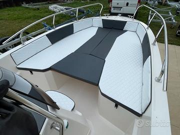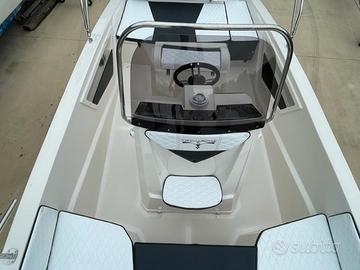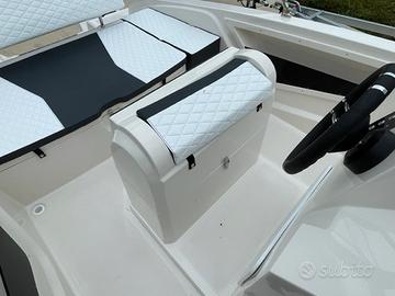 Impianto elettrico completo di luci di via e 360°, serbatoio benzina 70 litri con carico benzina esterno, pulpito in acciaio inox, pompa di sentina, tasche laterali porta oggetti, bitte e golfari in acciaio inox, musone di prua per ancora, sedile di guida, plancia comandi con volante e cavo timoneria, parabrezza con finitura in acciaio inox, cuscineria completa, scaletta bagno in acciaio inox, staccabatteria, tromba elettrica, prendisole di prua e prendisole di poppa con cuscineria.