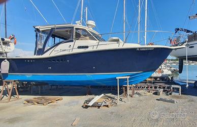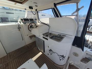 Tuccoli 300 ottimo stato, motorizzato con 2 motori entrobordo diesel - Iveco Aifo - 250 CV - revisionati pari al nuovo - linea d'asse. Teli e cuscineria memorex ottimo stato. 4 posti letto + 1 bagno con doccia. Cucina con frigorifero. Trattamento con prop speed, trolling valve su entrambi i motori. Motori con 300 ore già tagliandati. Lunghezza 30 piedi Larghezza 3 mt Pescaggio 1mt Serbatoio carburante 650 L Serbatoio acqua 2x120 L Console accessoriata per la pesca e navigazione d'altura. Bandiera POL. Accessori: Multifunzione Lowrance 9 pollici a colori touch screen, con trasduttore, cartografico, radar 4G ed eventualmente altro multifunzione Lowrance 9 pollici live. Pilota automatico Raymarine VHF Flap elettrici 5 portacanna su hard top 2 divergenti 5 portacanna sul pozzetto Vasca del vivo Pompa lavaggio pozzetto con acqua di mare Doccia con acqua calda e fredda sul pozzetto faro elettrico con telecomando Illuminazione interna ed esterna led, luci sub a led Spiaggetta a filo acqua e pozzetto con rivestimento in teak. Passerella richiudibile con carabottino N. 3 prese per mulinelli elettrici Motore di prua MOTORGUIDE XI5-105SW fuoribordo elettrico con batteria al litio da 36 Volt + caricabatteria. Inverter Vicrton e pannello solare da 700 watt.