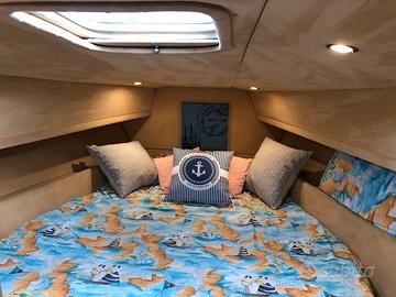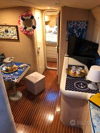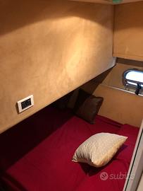 Cabina armatoriale a prua, cabina matrimoniale a poppa, dinette trasformabile, cucina lato dritta, locale wc con doccia ( acqua calda )sul lato sx. Strumentazione e dotazioni di bordo: GPS, VHF, elica di prua, passerella idraulica con telecomando, impianto hi-fi con cd, antenna tv. Dotazione armamento: Tender Plancetta di poppa allungata, 2 frigoriferi , gruppo elettrogeno, boiler, tendalini nuovi ( chiusura invernale completa )