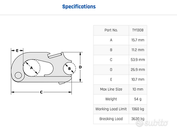 Tylaska J8 – Snap Shackle professionale – condizioni eccellenti Disponibili 2 pezzi (il prezzo di riferisce al pezzo unitario) Vendo Tylaska J8 originale, gancio a sgancio rapido di altissima qualità, utilizzato in ambito nautico professionale e regata. 🔧 Condizioni: usato, pari al nuovo, perfettamente funzionante, nessun gioco o difetto. Sempre lavato e mantenuto dopo utilizzo. ⚙️ Caratteristiche principali: Sistema trigger release (sgancio rapido anche sotto carico) Costruzione in acciaio inox marino ad alta resistenza Rotazione su girella integrata (swivel) Ideale per utilizzi gravosi e applicazioni critiche Meccanismo fluido e affidabile anche in condizioni estreme 📐 Modello: Tylaska J8 ➡️ Perfetto per: scotte randa/genoa barber, vang, attrezzature di coperta utilizzo su imbarcazioni da regata o crociera performante 💡 Perché scegliere Tylaska: Marchio di riferimento mondiale per sicurezza e qualità. Utilizzato anche in ambito professionale e oceanico.