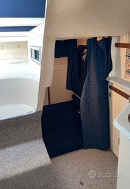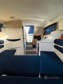La zona interna presenta il solito divano a V che corre lungo le murate, all'occorrenza può diventare una cuccetta doppia oppure una pratica dinette. L'angolo cottura è completo di lavello, fuochi a gas, frigorifero e, di fronte, si apre un bagno ; infine una seconda cuccetta( da 1 piazza e mezza ) è a centro barca, sfruttando il volume della plancia.