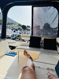 Tutto è dove ti aspetti di trovarlo. L'acceso al pozzetto è pratico e agevole così come le sedute che sono confortevoli: un divanetto a L corre sulla murata di sinistra per chiudersi con una chaise longue in corrispondenza della tuga. Al centro c'è il tambuccio di accesso agli interni e a dritta la seduta fronte marcia raddoppiata da una alle spalle (con sotto un ampio gavone).