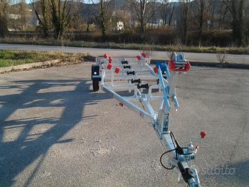 UNIKAR 950 FRENATO Peso complessivo a pieno carico: 950 kg Portata kg 700 Lunghezza: 6.3 m + allungamento porta fanali post. larghezza totale 2020, misura gomme 165 /80 r13 Traversa posteriore regolabile, telaio basculante interamente saldato con profilo dei longheroni in tubolari, rinforzato e zincato a caldo, parafanghi in ABS, porta targa e fanali in alluminio bugnato robusto ma leggero Allestimento completo: – Argano – n.2 Kit rulli laterali doppi – n.2 Kit rulli laterali quadrupli – n.4 Kit rullo centrale singolo – n.1 Kit rulli centrali doppi PREZZO € 2.950,00 ESCLUSO IMMATRICOLAZIONE PER CONTATTI