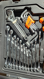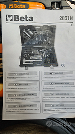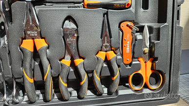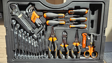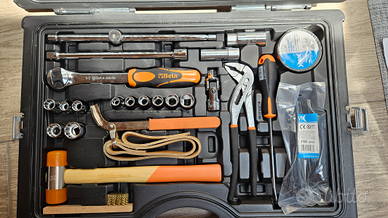 Contenuto : chiavi combinate 7-8-10-12-13-14-17-19 mm; - chiavi a forchetta 3/8x7/16 - 1/2x9/16 - 5/8x11/16"; chiavi maschio esagonali piegate 1,5 :10 mm; - chiave regolabile a rullino 200 mm; chiavi a bussola esagonali 1/2", 10-12-13-14-17-19 mm; - chiavi a bussola poligonali 1/2", 7/16 -1/2 - 9/16 - 11/16 - 7/8"; prolunga 255 mm - 1/2"; - snodo 1/2"; quadro maschio 1/2" con spina scorrevole; cricchetto reversibile 1/2"; chiave a bussola per candele, 16 - 20,8 mm; pinza regolabile autobloccante 240 mm; tronchese a grande effetto taglienti diagonali 160 mm; forbici per elettricisti lame dritte; pinza universale 180 mm; pinza a becchi mezzotondi diritti 160 mm; giravite lama piatta 3x75 - 4x100 - 5,5x150 - 6,5x150 mm; giravite Phillips® PH1x80 - PH2x100 mm; mazzuola con battente in materiale plastico Ø 35 mm; chiave a nastro per filtri olio; spazzolino fili ottone; coltello a serramanico per nautica; fascette BM; nastro isolante 25 m
