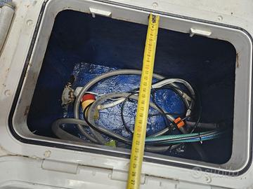 Vasca del vivo in vtr e poliuretano, doppio strato vtr (interno esterno). Misure 60 x 40 x 50 di altezza, sportello 35 x 25. Due ingressi acqua un troppo pieno e uno scarico. Tubi raccordi e pompa di sentina compresi