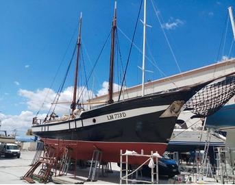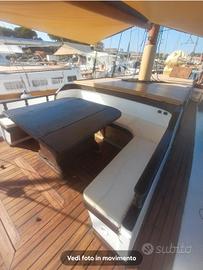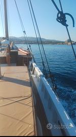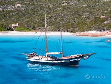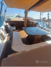 Goletta 16.00 mt x 4.00 mt Motore Boduin 160 cv Invertitore da lavoro Masson rapporto di riduzione 3/1 Cabina di poppa allestita con cucina totalmente rifatta 2025 con 2 fuochi, due pozzetti lavello, grande piano da lavoro, frigorifero/freezer 110 lt 24V - 220 V nuovo 2025 Cabina di prua con tavolo e divano a L, bagno con wc elettrico nuovo 2025. Cala vele/deposito a estrema prua. Dinette esterna a centro barca con divano a C e grosso tavolo, tavolo a poppa con sedute dietro la timoneria. Cuscineria esterna completa, ampio prendisole. Grosso tendalino parasole impermeabile nuovo maggio 2025. Alberi e bompresso sbarcati e riverniciati aprile 2025 Serbatoi carburante 2 x 600 lt Serbatoi acqua 2 x 450 Caricabatterie nuovo 2025 6 batterie nuove 2025 Verricello salpancora 2000w comando prua e poppa, 50 mt catena con ancora Hall 30 kg. Timoneria completamente revisionata compresa la losca 2025 Elica bilanciata maggio 2025 Imbarcazione sempre manutenzionata, coperta nuova in iroko 2021, buona parte del fasciame nuovo maggio 2025, disponibile documentazione fotografica. Barca con grandi spazi e ideale per attivitá di charter. Portata omologata, 16 passeggeri. Velocitá di crociera 8.5 nodi velocita massima 11.5 nodi.