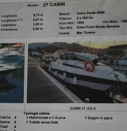 Vendo barca modello gobbi 27 cabin accessoriata di inverter pannelli fotovoltaici tendalino nuovo fatto nel2023 2 cabine bagno con doccia acqua calda motori benzina volvo penta 500b tenuta molto bene vendo con motori da rivedere .no perditempo .Vista e piaciuta .