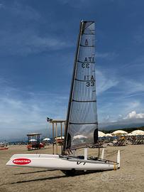 Catamarano Bimare V1 World Sailing Plaque n° 1134 con vela in membrana Landemberg Sail Button n° 15039, numero velico 33, albero Bimare, completo e pronto a navigare oltre a carrello alaggio ruote ballon, copertura, copritimoni e buste per derive anno 2024.