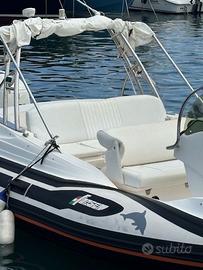 Vendo Gommone ZAR 65 del 2002 con motore Suzuky 200 cv 6 cilindri del 2015 usato soli 6 estati per 25 giorni/anno . Accessoriato con prendise di poppa e di prua, Roll bar, tavolo in legno, 2 batterie e staccabatterie , serbatoio Inox da 260 litri, doccetta con serbatoio acqua dolce da 50 litri, salpancora elettrico, cuscineria completa in ottimo stato; impianto elettrico rifatto questo inverno, adesivi rifatti nel '23 ; appena tagliandato e rimessato al coperro . visibile a Porto Pozzo ( pressi di Santa Teresa di Gallura