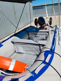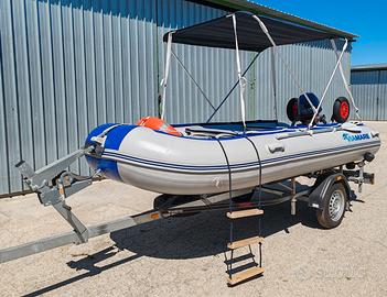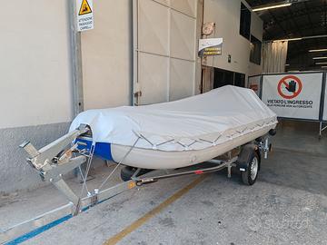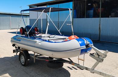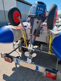 Set gommone e motore. NO RIMORCHIO. Gommone Viamare 380 S ALU chiglia pneumatica, 3,8 metri, con pagliolato in alluminio, anno 2018. Motore Yamaha 15 cavalli 4 tempi ultima serie, anno 2007. Gommone con i seguenti accessori: - ruote di alaggio in acciaio inox - doppia panca - due borse/cuscini sottopanca per seduta e stivaggio (acquistate un mese fa, mai entrate in mare) - scaletta di risalita - tendalino - telo copri-gommone realizzato da tappezzeria nautica su misura (settembre 2024) - borsoni per il trasporto da sgonfio (nuovi, mai utilizzati). Motore Yamaha IMPECCABILE, potente e dai consumi irrisori. Smisurato il valore degli accessori... Sempre rimessato al coperto con manutenzione periodica ogni fine stagione, mai utilizzato per la pesca. Utilizzato con camper solo per passeggiate di famiglia. Tutto manutenuto in condizioni perfette. Cura maniacale. Tubolari e chiglia intatti, nessuna foratura e riparazione.
