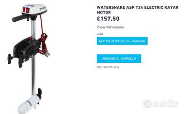Il fuoribordo elettrico Watersnake ASP T24 SW 24-24" - 12V è progettato appositamente per kayak e piccole canoe e hanno un raccordo regolabile per il montaggio sullo specchio di poppa per un facile fissaggio.