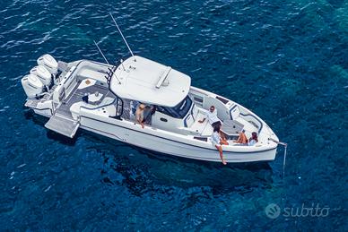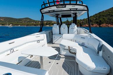 CONCESSIONARI UFFICIALI PER LA SARDEGNA Una barca open con ampi spazi dalle prestazioni senza rivali. Ma non solo, il 38 T-Top è pensato soprattutto per gli amanti dell’adrenalina. Con una lunghezza di 38’4” (11,69 m), il Wellcraft 38 T-Top vanta spazi dedicati al comfort senza paragoni, mentre la murata abbattibile di poppa consente di avere una piattaforma da bagno innovativa che offre un accesso all’acqua impareggiabile. Specifiche Tecniche: Lunghezza massima complessiva: 11,7 metri Lunghezza dello scafo: 10,75 metri Larghezza:3,3 metri Capacità del carburante: 1007 L Capacità idrica: 159 L Pescaggio approssimativo verso il basso: 79 cm Opzioni di alimentazione: Mercury® 3x350 HP V10 XL Cold Fusion bianco con joystick Mercury® 2x350 HP V10 Cold Fusion bianco con joystick Yamaha 3x300HP V6 Bianco con HELMMASTER Yamaha 3x350HP V6 Bianco con HELMMASTER Mercury® 2x350 HP V10 XL Cold Fusion Bianco Mercury® 3x300 HP V8 XL Cold Fusion Bianco Mercury® 3x350HP V10 XL Cold Fusion Bianco A PARTIRE DA EURO 247.400,00 CON MERCURY 2X350 HP V10 XL COLD FUSION WHITE esclusa iva. I PREZZI SI INTENDONO A PARTIRE DA... ESCLUSO IVA*, TRASPORTO OPTIONAL E ALLESTIMENTO ALLA BOA. GLI IMPORTI SONO VALIDI SALVO VARIAZIONI LISTINO.