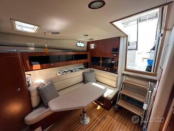Pozzetto con freezer, vasca del vivo, panca ribaltabile con cuscino, presa per mulinello elettrico, vasche del pescato con pompa maceratrice, doccia esterna calda/fredda; tendalino di poppa con pali di carbonio. Cabina open space con un letto matrimoniale, una dinette con tavolo (2 posti letto) con pavimento in teak e gavone porta canne. 2 armadi con ripiani e luci di cortesia, cucina in vetroceramica a 2 fuochi e forno a microonde, frigorifero, lavello e rubinetto inox, oblò con zanzariere. Wc marino elettrico, serbatoio acque nere. Aria condizionata con riscaldamento.