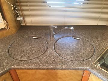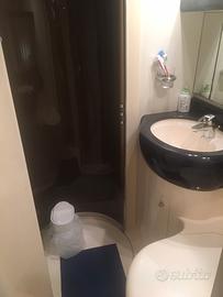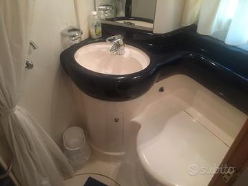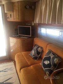 Imbarcazione in buone condizioni, interni in radica e calpestio in mogano filettato nel salone e nelle cabine. Versione 2 cabine: cabina armatore con letto matrimoniale a prua e cabina ospiti con n°2 letti in piano. Bagno armatore con WC, lavello, box doccia. Bagno ospiti con WC, lavello e doccia.