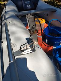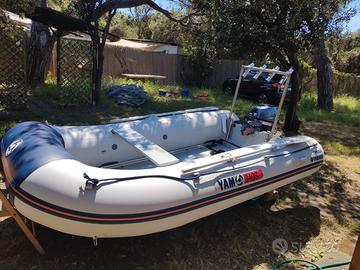 Tender Yam340S (336x174cm) con pagliolo in alluminio e chiglia gonfiabile. Abbinato a motore Yamaha 8cv (F8CMHS). Tutto acquistato nel 2016 ma utilizzato per la prima volta dal 2020 solo in estate. Il piccolo gommone è attrezzato per la pesca e ceduto con i seguenti accessori: