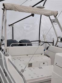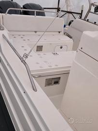 Disposizione esterni: grande prendisole a prua completo di cuscineria, a poppa il pozzetto presenta una comoda seduta ed una postazione con 2 fuochi ed un lavello.
