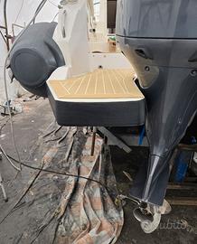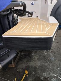 Disposizione esterni: grande prendisole a prua completo di cuscineria, a poppa il pozzetto presenta una comoda seduta ed una postazione con 2 fuochi ed un lavello.