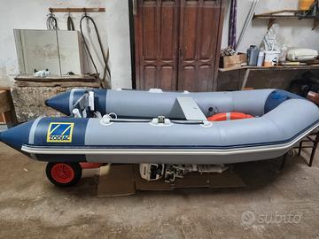Vendo gommone Zodiac C310s gonfiabile (omologato per 4 persone), paiolato originale zodiac ad alta resistenza, pompa a piede, remi, ruote alaggio (pneumatici nuovi), motore Johnson 4.5hp (si può tranquillamente portare a 10hp) in perfette condizioni, rimessato ogni anno, il tutto con documenti.