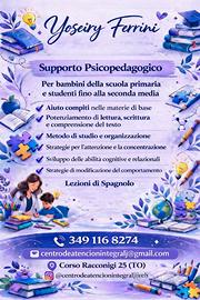 Un caro saluto a mamme e papà! L'educazione dei nostri bambini è un lavoro di squadra. Per questo offro un accompagnamento educativo pensato per sostenere sia i bambini che le loro famiglie. AIUTO COMPITI & RIPETIZIONI DI SPAGNOLO. Per bambini della scuola elementari. Prima sessione di valutazione GRATUITA AIUTO COMPITI oSupporto nello svolgimento dei compiti o Accompagnamento allo studio Supporto per bambini e adolescenti con difficoltà di apprendimento. RIPETIZIONI DI SPAGNOLO Lezioni di spagnolo per bambini e adolescenti Metodo rispettoso, motivante ed empatico Lezioni in presenza e online. Piani personalizzati secondo l'età e le esigenze del bambino. Credo fermamente che mamma e papà abbiano un ruolo fondamentale nella crescita e nel percorso educativo dei propri figli, e il mio lavoro vuole essere un supporto per tutta la famiglia. Per maggiori informazioni e disponibilità, potete scrivermi con fiducia. CONTATTI Corso Racconigi - ON LINE 349 116 8274 - Yoseiry Ferrini