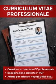 A soli 5 euro realizzo curriculum vitae professionali chiari, ordinati e pronti per essere inviati alle aziende. Offro supporto per: creazione CV da zero correzione curriculum già esistente miglioramento grafico e impaginazione adattamento del CV al tipo di lavoro consegna in PDF pronto da inviare o stampare Servizio utile per chi cerca lavoro in negozi, uffici, studi medici, aziende, ristorazione, magazzino e altri settori. Massima serietà e attenzione alla presentazione del profilo. Disponibile anche a distanza. Contattami in privato per informazioni.