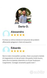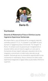 Laureato in ingegneria con vent'anni di esperienza nello svolgimento di lezioni private. Ottime capacità di comunicazione, massima disponibilità (on line e in presenza) e prezzi moderati.