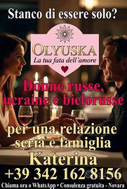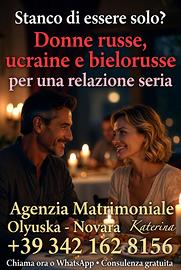 Agenzia Matrimoniale Olyuska a Novara specializzata in incontri seri tra uomini italiani single/divorziati e donne russe, ucraine e bielorusse con valori tradizionali. Offriamo: o Consulenza al cellulare è gratuita e riservata oProfili verificati e motivati a una relazione stabile o matrimonio o Aiutiamo a conoscere donne serie pronte a trasferirsi in Italia. Sede a Novara (Piemonte) Chiama o scrivi su WhatsApp: Katerina +39 342 162 8156 Solo per uomini seri e motivati.