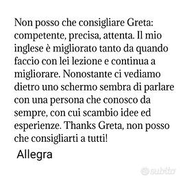 Oggi mi occupo esclusivamente di sessioni individuali di lezione con professionisti e tutti gli adulti che vogliono migliorare o iniziare ad imparare l'inglese, studenti universitari e della scuola superiore.