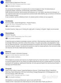 LEZIONI DI INGLESE ONLINE - VALUTAZIONE IN DIRETTA GRATUITO! Hai bisogno di aiuto in inglese generale o inglese specifico / tecnico per il lavoro? Sono madrelingua inglese, nato e cresciuto nello stato di New York, Stati Uniti. Ho un background in business a New York City, e sono un insegnante di inglese e tradutore per studenti italiani da oltre 8 anni. Possibilità di lezioni in modalità online da lunedì a venerdì. Parlo italiano a livello C1 e fornisco spiegazioni e correzioni sia in italiano che in inglese. Se desideri migliorare il tuo inglese, chiamami o mandami un messaggio tramite WhatsApp! Chris Kracke - 3479510676 Lezioni private singole e/o di gruppo - Inglese Generale - Conversazione - Business English + Colloqui di Lavoro per adulti - Ripetizioni - Traduzioni Ogni lezione è personalizzata in base alle tue esigenze, con un approccio pratico e orientato ai risultati e sono focalizzate su situazioni reali, dalla comunicazione quotidiana alle presentazioni aziendali, o per aiutarti in ogni contesto. Il mio obiettivo è aiutarti a comunicare con fiducia e competenza e per rendere il tuo inglese fluente e sicuro. Se ti serve tradurre qualsiasi cosa, piccola o grande che sia, posso aiutarti. Fornisco traduzioni e 'proofreading/controllata' dall'italiano all'inglese per: Pubblicità, Siti web, Social, CV / Curriculum, Profilo LinkedIn, Presentazioni professionali, Tesi, Menù, Documenti generali, Business, Turismo, Contratti di lavoro per aziende