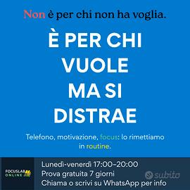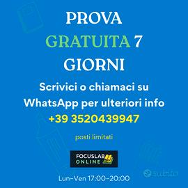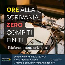 FocusLab Online è l'aula studio digitale con Tutor specializzato che insegna l'organizzazione e l'autonomia. Tutti i giorni, dalle 17:00 alle 20:00, senza distrazioni, per studiare tutte le materie (Matematica, Inglese, Italiano, Storia, Latino, ecc.). A soli 99 euro al mese.