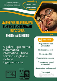Insegnante privato con esperienza pluriennale nell'ambito della formazione offre aiuto compiti e supporto scolastico per materie scientifiche a studenti di scuola secondaria di primo e secondo grado, assistenza universitaria per preparazione esami delle facoltà di Ingegneria ed Economia e supporto per preparazione test di ammissione per le facoltà a numero programmato. Disponibile a domicilo, on line e presso centro multispecialistico Katane Lab, zona Vulcania, Catania.