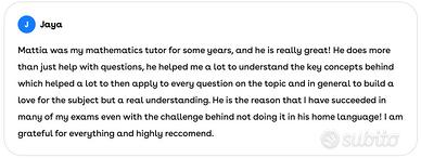 AL MOMENTO NON PRENDO NUOVI STUDENTI Ho conseguito la laurea magistrale in matematica, a indirizzo didattico, con 110 e lode all'Università di Bologna e sto per conseguire l'abilitazione nazionale all'insegnamento nelle scuole superiori. Offro lezioni di matematica e fisica online o in presenza a Bologna, in italiano o in inglese. Ho ormai dieci anni di esperienza di lezioni private di matematica e ho anche svolto attività di insegnamento al liceo scientifico. Collaboro con case editrici nella redazione di testi scolastici di matematica e scrivo articoli per una rivista di divulgazione scientifica. Mi piace molto trasmettere le conoscenze e aiutare gli altri a trovare il proprio rapporto con queste materie stupende! Il miglior modo, e forse l'unico, per imparare la matematica e la fisica è fare matematica e fisica. Per questo, nelle mie lezioni, lo studente è sempre attivo, viene accompagnato nel produrre ragionamenti in autonomia e nulla viene impartito asetticamente dall'alto. Metto il massimo impegno affinché ci si senta completamente liberi di esprimere qualsiasi domanda, dubbio, perplessità, senza giudizio e costruendo insieme la conoscenza. Cerco di accompagnare lo studente nell'apprendere ad affrontare gli esercizi senza paura dell'errore, e a capire e interiorizzare la teoria, con uno sguardo sempre attento agli esempi concreti e alle situazioni di vita reale in cui la matematica e la fisica sono protagoniste. Nelle lezioni online utilizzo un tablet con la lavagna condivisa e la webcam per mantenere l'interazione visiva, e al termine viene sempre fornito allo studente il file pdf di tutto ciò che è stato prodotto. Tariffa: 30 euro/h.