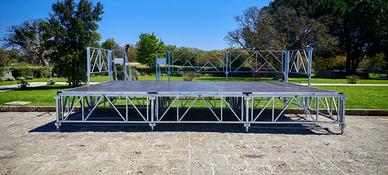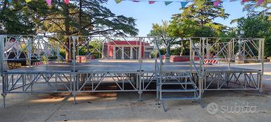 Noleggio PALCO MODULARE dim massime 8x6mt e minime 2x2 mt con altezza minima cm 80 e massima 150composto da moduli standard di dimensioni mt. 2x2 , ad incastro per un rapido montaggio, con pilastri realizzati con tubolari di acciaio zincato di mm.50x50x3 correnti con tubolari in acciaio zincato di varie dimensioni, progettato e collaudato con sistema a cavalletti nel rispetto delle normative vigenti. Il palco è corredato di BASETTE REGOLABILI a vite (per regolazione fine ) per livellarlo secondo l'andamento del terreno e compensare i dislivelli. SCALA DI ACCESSO realizzata interamente in acciaio zincato con gradini antisdrucciolo ed applicabile in qualsiasi punto del palco. PARAPETTO SU TRE LATI di altezza superiore al metro secondo le normative vigenti in materia di parapetti e balaustre con tenuta alla spinta certificata di 300 Kg/ml. per azioni e sovraccarichi come per legge). La pavimentazione è costituita da pannelli in MULTISTRATO DI BETULLA 19 strati CARPLAY ignifugo Classe 1. Indicato sia per Esterni che per interni. CERTIFICAZIONI Il palco è corredato di CERTIFICATO DI IDONEITA' STATICA (Portata di Kg.600/mq certificata da calcoli di verifica statica e disegni) secondo le normative vigenti. Al termine dell'allestimento del palco verrà fornito CERTIFICATO DI CORRETTO MONTAGGIO. Certificato IGNIFUGO classe 1. Il palco è realizzato applicando la norma armonizzata UNI EN 1090 prevista per la costruzione di strutture metalliche, quindi sono marcati CE e conformi alle disposizioni previste per legge. Per ogni singolo palco viene rilasciata in allegato una dichiarazione di conformità e sul palco la Targhetta Identificativa di Marcatura CE prevista dalla legge, unitamente ai MANUALI di Montaggio Uso Manutenzione ed Installazione. Puglia, Provincia di Bari