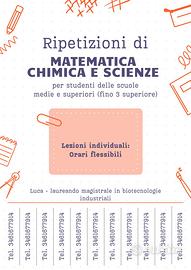 Ciao, sono Luca e sono laureato in Biologia all'università di Padova, attualmente frequento la laurea magistrale in Biotecnologie industriali. Offro lezioni di matematica, scienze, chimica e materie scientifiche a studenti delle elementari, medie e superiori.
