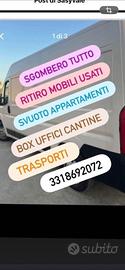 Salve , si effettuano servizi di sgombero appartamenti, svuota cantine, garage e box a prezzi modici , tutto smaltito regolarmente. Offriamo anche servizio di traslochi, trasporti e servizio scala. Si noleggia anche solo il furgone però con conducente.Per preventivi gratuiti contattare tramite whatsapp al 3318692072 Salvatore.