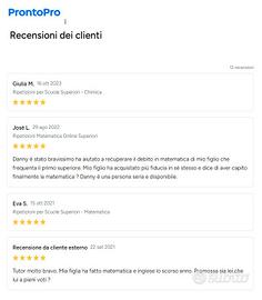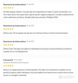 Laureato in Scienze (110 e lode) con percorso di eccellenza, diplomato al Liceo Scientifico (100/100), docente di scuole medie e superiori con esperienza pluriennale come tutor in assistenza allo studio e ottimo inglese (soggiorni e corsi di inglese all'estero), offre lezioni private e ripetizioni a studenti di Università, Scuole Superiori e Scuole Medie.