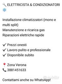 Salve , offro assistenza tecnica/ impianti elettrici, montaggio condizionatore piccole lavori idraulici...ecco , il mio contatto telefonico 3881451633 Verona .