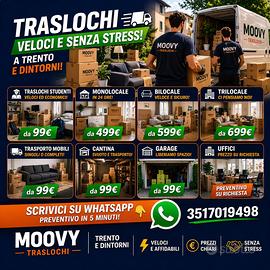 Moovy è la nuova realtà di Trento alla quale affidarsi per avere un trasloco veloce, sicuro ed al giusto prezzo. Serietà e professionalità sono gli elementi che ci caratterizzano. Offriamo vari servizi: Trasloco chiavi in mano Trasloco completo Trasloco fai da te Trasloco stanza universitaria Svuotamento cantine/garage Trasloco per uffici e piccole aziende Scrivici su whatsapp per avere un preventivo gratuito o visita il nostro sito web www.moovytraslochi.it