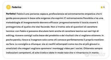 Oltre al montaggio video, offro riprese con attrezzatura professionale. Se preferisci, posso utilizzare video stock di alta qualità o guidarti da remoto per effettuare riprese ottimali direttamente con il tuo smartphone. Al montaggio e alla post-produzione penserò io, assicurandoti un risultato finale impeccabile.